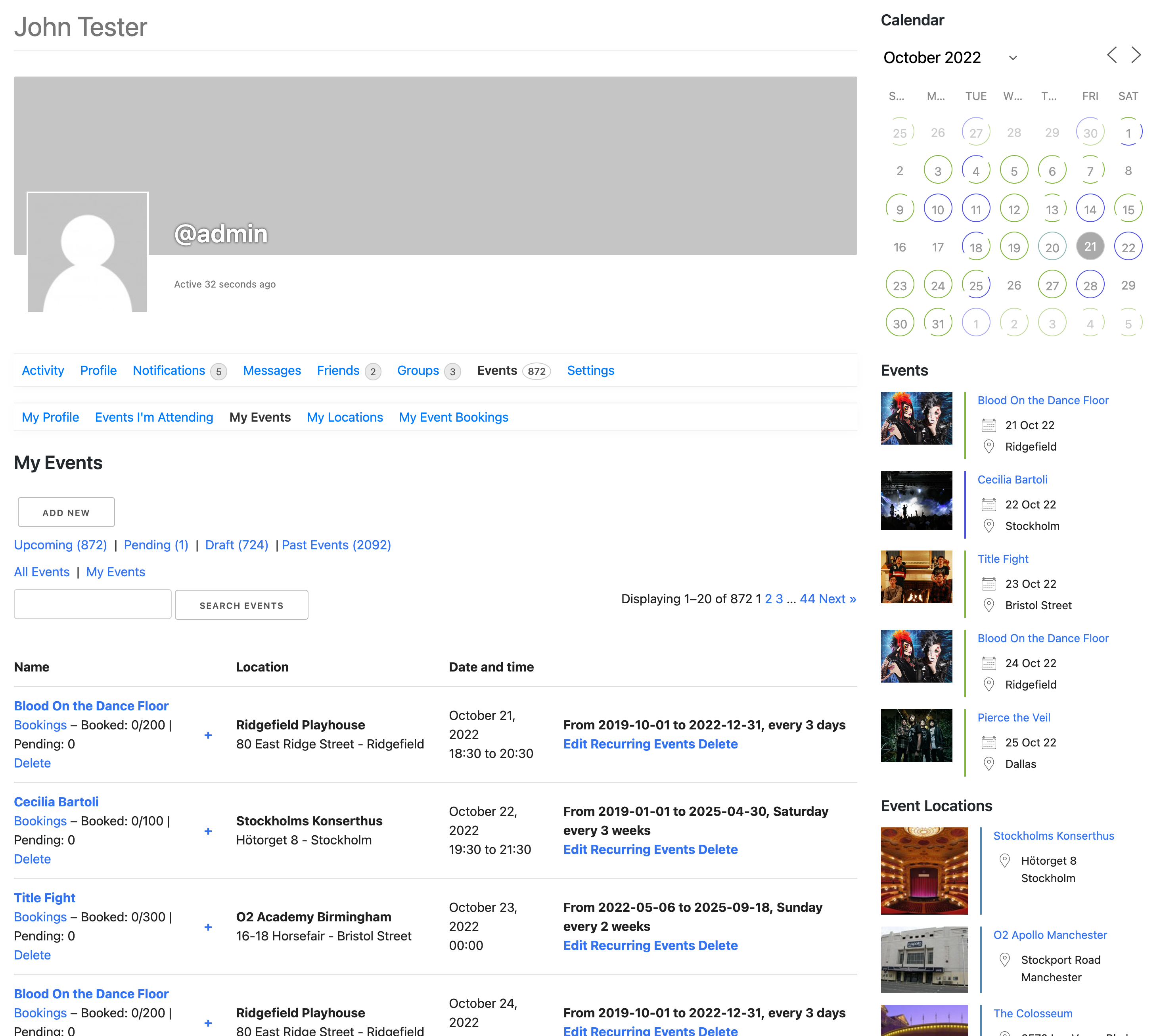 Members and guests can create and manage their events and bookings without entering the admin area.